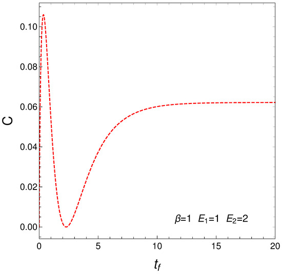 This measure of the statistical complexity originated about 25 years ago and has become quite popular, being used for variegated purposes. We just cite here [3,4,5,6,7]. We now depict in Figure 6 C versus time in the context of our master equation. We clearly see that our two regimes exhibit different levels of complexity.