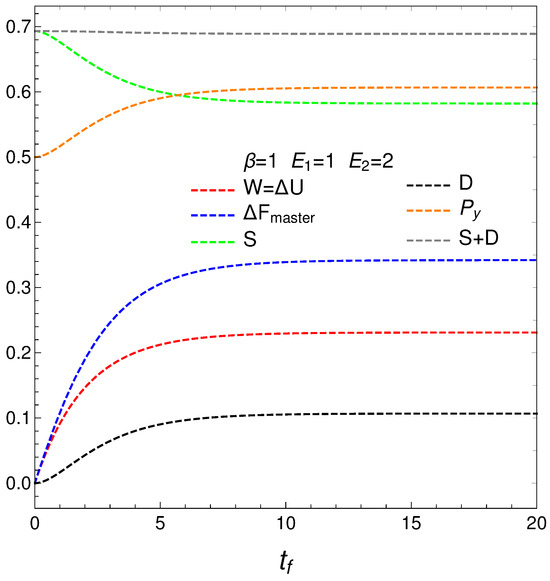 This graph is intended as a complement of Figure 2. The horizontal axis displays the final time . The plot depicts the mean energy difference . In similar fashion, also , the disequilibrium D, purity , and entropy S versus , with , , , and initial conditions and . What we learned from Figure 2 is reinforced here using different quantities. Note that near stationarity order again balances disorder.
