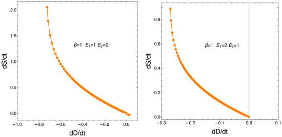 This relation between the rates of change of order and disorder is illustrated next. These rates are positively correlated, as one intuitively expects. We consider two situations: (a) , and (b) . No important differences ensue between (a) and (b). See the results depicted in Figure 11.