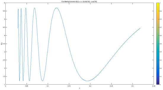 For , the number is relatively small, and the function f is highly oscillating close to a; see Figure 2. Next, we have