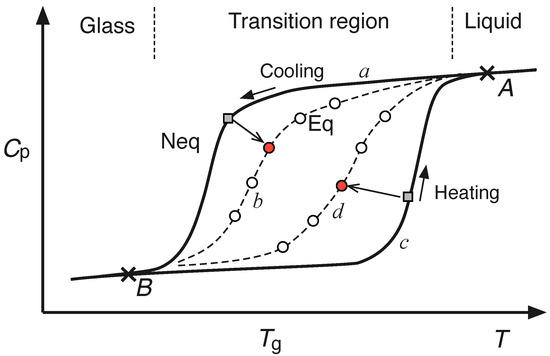 - Shirai, K. A thermodynamic description of the hysteresis in specific-heat curves in glass transitions. J. Phys. Commun. 2021, 5, 015004. [Google Scholar] [CrossRef]