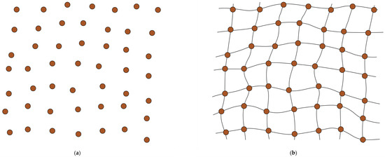 The meaning of order/disorder in thermodynamics was seriously studied in information theory, from which the notion of missing information emerged [40,79,80,81,82,83,84,85,86]. If we look at the number 3.14159⋯, it looks like a random number, yet conveys useful information [87,88,89]. An English text would appear to be just a series of random letters to someone who does not know English. If we do not know the meaning of the arrangement of nucleotides in DNA, they seem merely a random array. These examples urge us to reflect on the definition of randomness. In information theory, where there is no idea of crystal symmetry, the missing information has generality. An atom arrangement is shown in Figure 2a. There is no periodicity in the atom arrangement. However, this figure was drawn by removing the lines in Figure 2b, in which a square lattice is drawn in a distorted space. In a square lattice in the Cartesian coordinates, each atom is identified by the lattice address . The information of the address of atoms is not missed by deforming the space. Topologically, the two figures are equivalent.
