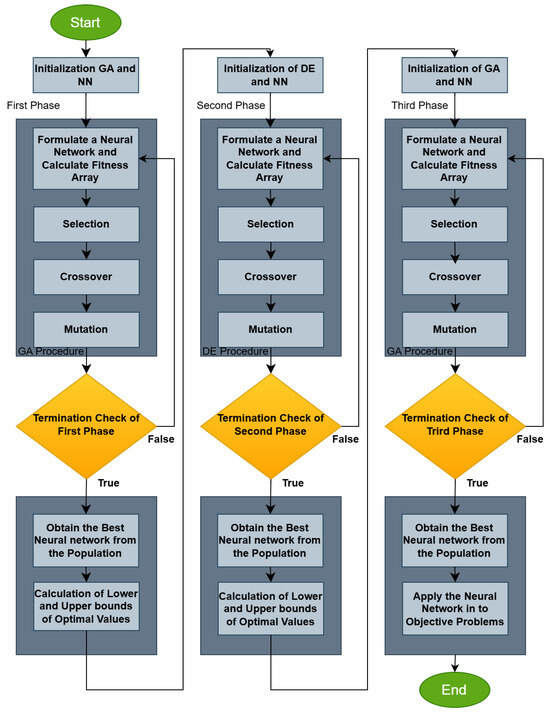This work proposes the adoption of a three-stage technique that has two goals: the effective training of artificial neural networks, and the avoidance of the phenomenon of overfitting. In the first phase, a genetic algorithm [40] is used to detect an initial range of values for the parameters of the artificial neural network. This genetic algorithm uses a modified version of the artificial neural network’s training error as a fitness function, in order to avoid the problem of overfitting. During the second phase of the proposed algorithm, a bounding technique that is based on the Differential Evolution algorithm [41] is used, in order to efficiently identify promising ranges for the parameters of the neural networks. The Differential Evolution method is used at this stage of the proposed procedure as it only has a small number of parameters that the user must initialize, but also because it has been used with great success in a wide range of practical optimization applications [42,43,44,45]. During the third phase, a genetic algorithm is applied to efficiently train the neural network using the bounds that have been produced in the second phase for the parameters of the model. The proposed method was applied on a wide series of classification and regression datasets, and a comparison was performed against traditional techniques for the training of neural networks. The basic building blocks of the proposed technique are as follows: