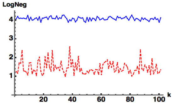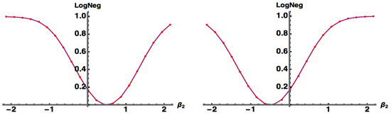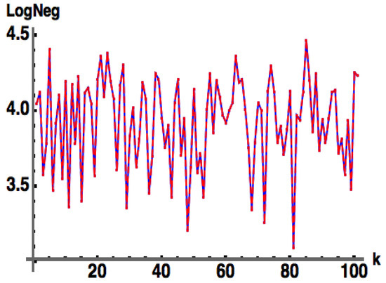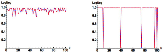 While the above measures of entanglement are applicable to pure states, entanglement measures for mixed states are harder to come by [8]. Measures of mixed state entanglement exist only for particular systems, such as Wotter’s concurrence [10] for a pair of qubits and for a qubit–qutrit system. A widely used “measure” of entanglement for both pure and mixed states, both discrete and continuous variable, is the Log Negativity () [11,12,13] given by where the negativity is given by the sum of the absolute values of the negative eigenvalues of the partial transpose of . This entanglement monotone is based on the fact that a separable state remains positive under partial transpose. It is not a true entanglement measure since it does not detect bound entanglement (i.e., states that are entangled, yet have positive partial transposes).