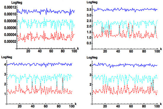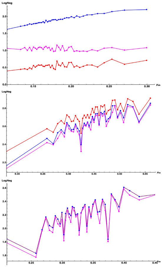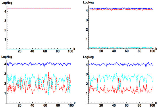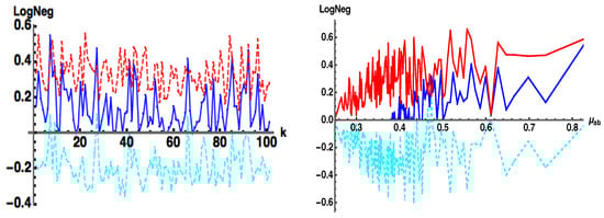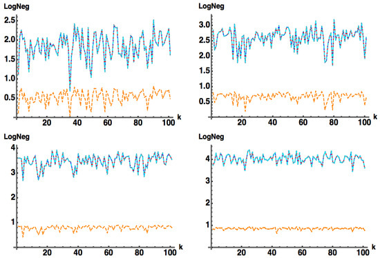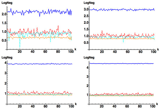 - —approximate (subscript a) Log Negativity (), computed by Equation (11b), with approximate Negativity computed in Equation (11a) from the wavefunction coefficients .