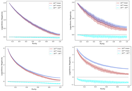 In Figure 7 we consider two values of (left and right columns, respectively), for two different values of (top and bottom rows, respectively). The blue-dashed line is the mean of for 100 sample points for each chosen value of the purity . The extreme edges of the shaded blue band about the dashed blue line represent the mean value plus and minus the standard deviation. Similar remarks hold for the solid red line/bands representing , and the solid cyan line/bands representing the difference . From the latter difference cyan curve/band, we see that , namely that even in these statistically perturbed cases (where again, for ), our approximate Log Negativity formula for pure bipartite states where is Hermitian, and acts as a lower bound to .