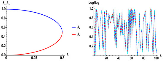 In Figure 8 (left) we plot . In Figure 8 (right) we plot (blue), (red) from Equation (11b), and (cyan) using the analytic eigenvalue in Equation (16b), for the bipartite state of two qubits, . The end result is that for the case of the pure bipartite case of two qubits there is only a single negative eigenvalue of the PT that contributes to the negativity, and it has the precise form of as given in Equation (11a), which has two terms in the sum summing to . For higher dimensions , it is then somewhat unexpected and surprising that in Equation (11a) produces the exact negativity when of dimension d.