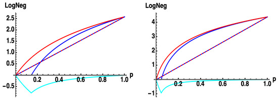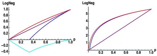 : for -dimensional Werner states with probability (to be in the pure state) : (blue, solid) , (red, solid) from Equation (17c), (cyan) . Average Log Legativity (ALN) (blue, dashed) , (red, dashed) , for uniformly random with (left) , (right) . Note: throughout all of . (overlapping red-dashed and blue-dashed curves).