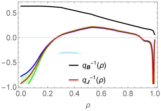 It has been proposed in Ref. [1] to inspect the resonant or non-resonant character of any perturbation with respect to both the magnetic and current density field lines. In toroidal geometry, the appropriate framework to do this is to use the Hamada coordinates , which are a canonical set of variables for both the magnetic and current density field lines. In the Hamada coordinates [42], if then . This allows a mode-by-mode topological classification [1]. Moreover, the and profiles of the axisymetric equilibria are intrinsic quantities that do not depend on the coordinate system, as long as the same magnetic surfaces are parameterized, so that and . Let us now consider some current density perturbation . This can be resonant for the current density field lines if, at some , or equivalently corresponding v or , one has , i.e., . It can also be resonant for the magnetic field lines if there exists some , such that . Let us use an example. Suppose that is smaller than 0.2 everywhere, whereas is above 1 so that has positive values smaller than 1. Then, the mode is magnetically resonant but is not associated with a resonant current density perturbation as . The same is true for all the modes such that .