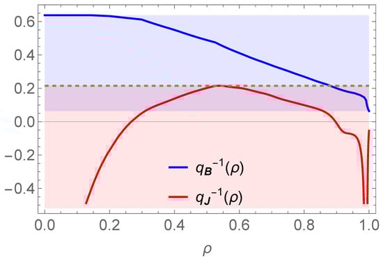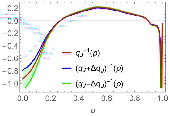 Evaluation of the winding profile, , of the current density field lines in the QH mode. To account for the imprecision in the digitization of the , and profiles and in the evaluation of the flux surface averages , the confidence band for this evaluation is plotted using Equation (10) with .