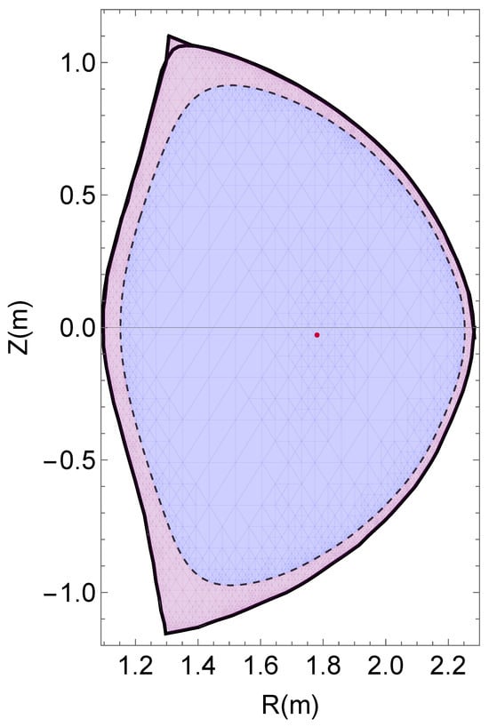 The plasma domain was extracted and digitized from Figure 2 of Ref. [33]. The last closed flux surface is the inner bold curve of Figure 1. In order to compute the flux surface averages of using Equation (6), one needs to know the flux contours. To achieve this, the Grad–Shafranov equation was solved using this last closed flux surface as the boundary of the computational domain. Figure 1 depicts the obtained approximation of the flux contours and the red dot reports the location of the magnetic axis obtained from Figure 2 of Ref. [33]. One can then proceed to the evaluation of the flux surface averages of . The resulting estimates are depicted in Figure 2. To account for some inevitable imprecision, a confidence band is drawn around the estimated curve, spanning values between 0.93 and 1.07 times the estimated .