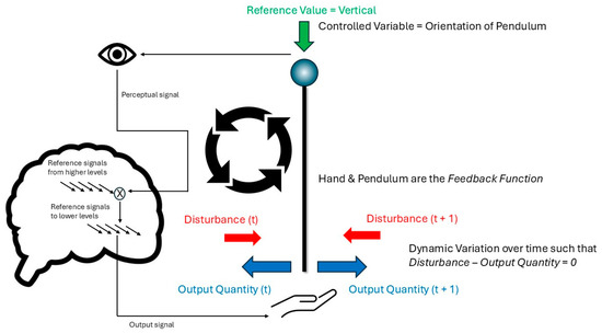The closed loop of PCT in the case of balancing an inverted pendulum. The diagram illustrates the dynamic variation in hand movement at the bottom of the pole to counteract disturbances to the vertical orientation of the pole, so that the pole is kept close to constantly vertical—the reference value. The source of control comes from higher level control systems in the agent, whose reference values are subtracted from incoming perceptual signals during this task (via the comparator illustrated by a cross in a circle; only one is illustrated for simplicity). The subtraction leads to an error signal that sets lower-level signals for outputs to the muscles of the arm and hand. The diagram is designed to illustrate that this loop is a continuous process that occurs during the performance of this behavior—balancing a pendulum—even in the absence of any learning.