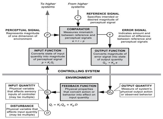 A control unit based on PCT. Reproduced with permission from Dag Forssell. Note: The figure shows the specific components of the closed loop in PCT. Inside the agent, a reference signal specifies the desired magnitude of the perceptual signal, which represents the current magnitude of one aspect of the environment (or self) to be controlled; this is known as the controlled variable (CV); for example, it could be the distance from a target destination. Each aspect of the environment is constructed from an input function, which transforms and integrates signals from lower levels to form the perceptual signal. The difference between the reference signal and perceptual signal is the error signal, which is transformed by the output function within the agent to act through the environment (via the feedback function) to counteract disturbances in the environment that affect the input quantity of the controlled variable.