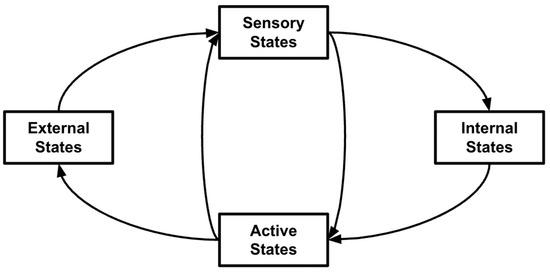 Figure illustrating the Markov blanket construction broadly, where external states constitute the environment while internal states constitute organismal variables that are causally separated from the environment, given sensory and active states. The sensory and active states constitute the Markov blanket mediating interaction between the environment and the agent.