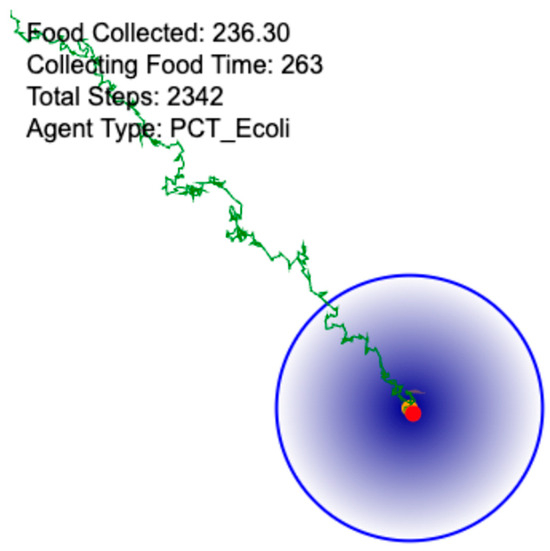 An image from a visualization of a PCT E. coli model’s trajectory to the target attractant. The red dot indicates the position of the E. coli. The yellow dot indicates the position of the target. The green trail indicates the path taken by the E. coli. The blue boundary represents the start of the area in which “food” is accumulated.