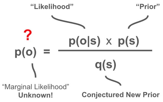 The equations for the exact form of Bayesian Inference are where , or the “posterior”, quantifies the optimal new beliefs about hidden state “s” after one observes an event, or “evidence”, which is denoted “o” for “observations”. In English, this is usually read “the probability of the hidden state given the observations”. In contrast, —is the “probability of observations given the hidden state”. This is called the “likelihood” and is an inversion of the posterior. Therefore, the likelihood quantifies beliefs about what hidden states are most likely to cause a particular observation. are “prior”, or current beliefs about the hidden state, while , also called the “marginal likelihood” of the observation—that is, the probability that a particular observation will occur, averaged over all possible hidden states according to their prior probabilities (). Importantly, while , , and are 1-Dimensional Probability Distributions, is matrix such that the product of and is the joint probability distribution which is referred to as the agent’s “generative model”.