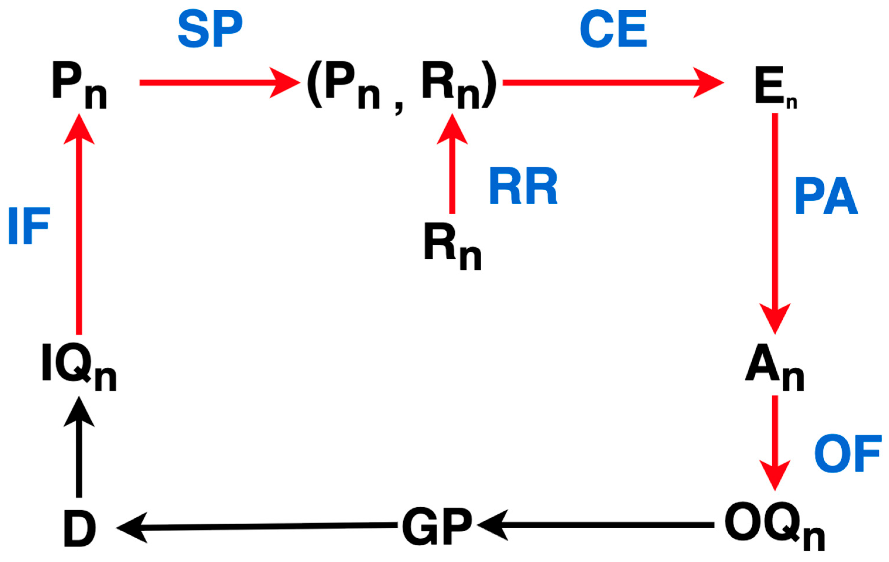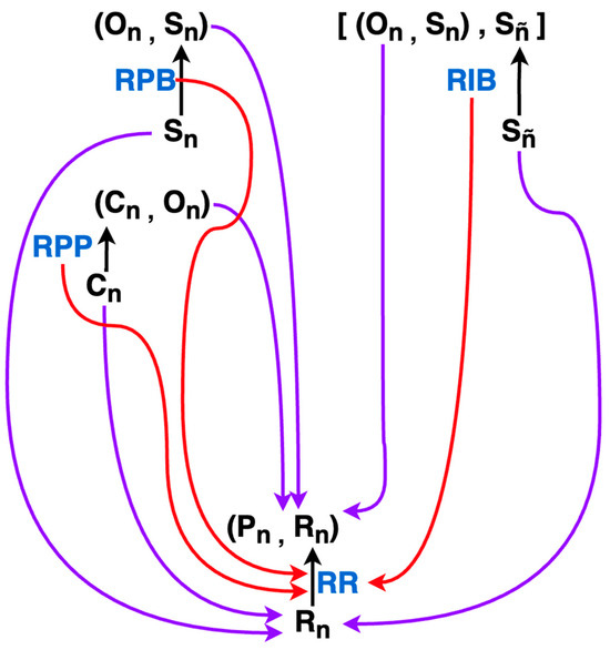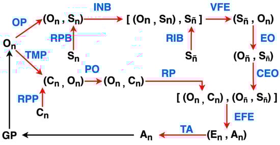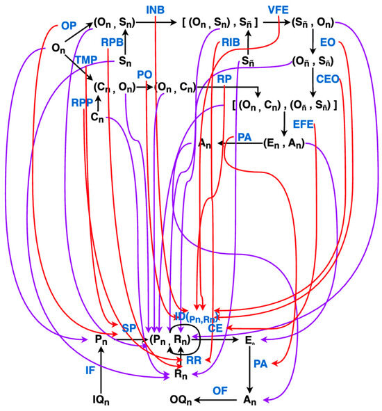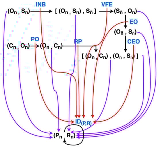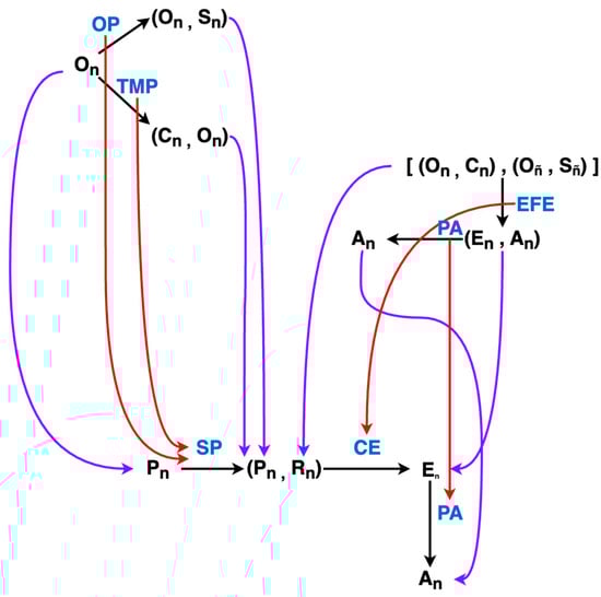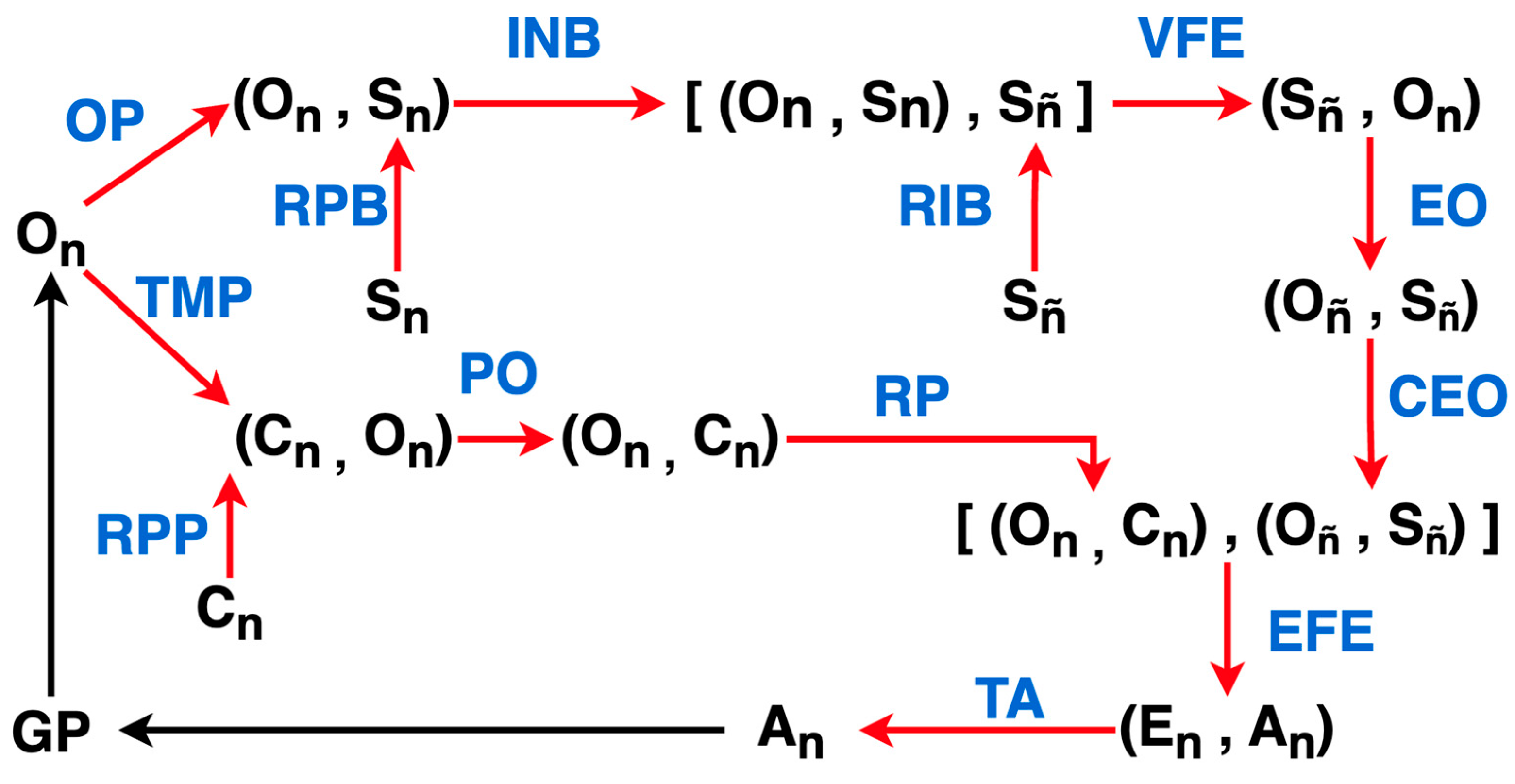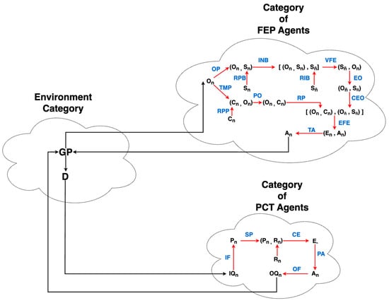 The PCT Agent Category. Morphisms that are internal to the category, that is, actually modeled explicitly by the PCT paradigm, are colored in red. Black morphisms indicate morphisms whose function may not be known and are located in the “environment category”. The blue symbols are the abbreviated names of all morphisms internal to the category which are not necessarily named as such in the literature.