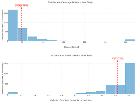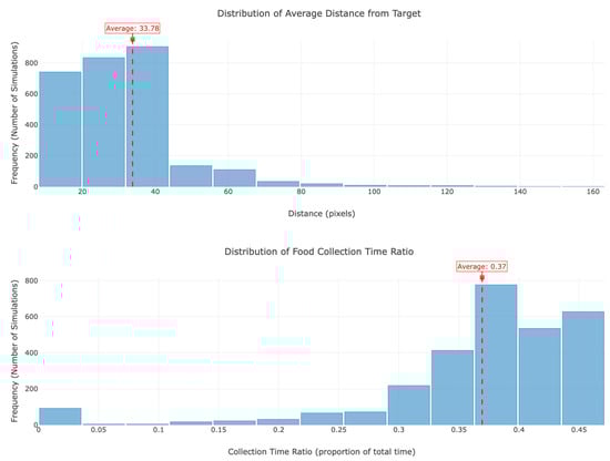 An illustration of the distribution of average distance from the center and the ratio of time spent collecting food for 2880 different PCT E. coli Model Parameters.