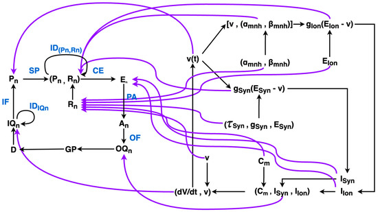 An illustration of a functor from a “Category of Hodgkin–Huxley Neurons” to the PCT Agent Category is illustrated in Figure N. For brevity, only object mappings for the functor are pictured. Many of these morphism mappings can be inferred given their source and target object mappings. When source and target objects are mapped to the same object in the target category, the morphism between them must be mapped to the identity of that target object. Note that is the total electrical state of the cell, which maps to a pair of the change in voltage and current voltage with the following morphism: . This is isomorphic with the composite morphism in the PCT category: . In other words, the total electrical state of the neuron is its output quantity, and the voltage of the cell is its input quantity.