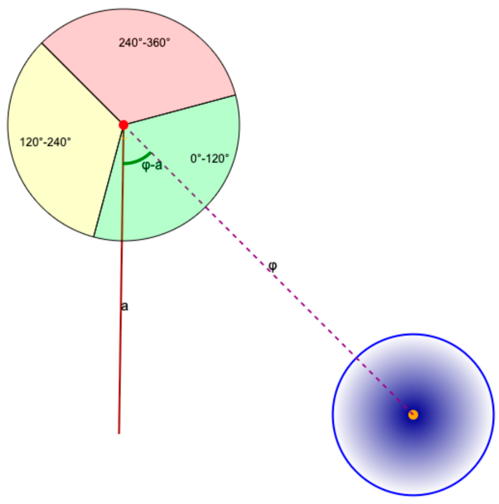 This figure illustrates the discretization of the perceptual signal into buckets that faithfully represent the difference between the angle the E. coli is facing and the angle between the E. coli and the target. The code reproducing the figure can be found attached to this article.