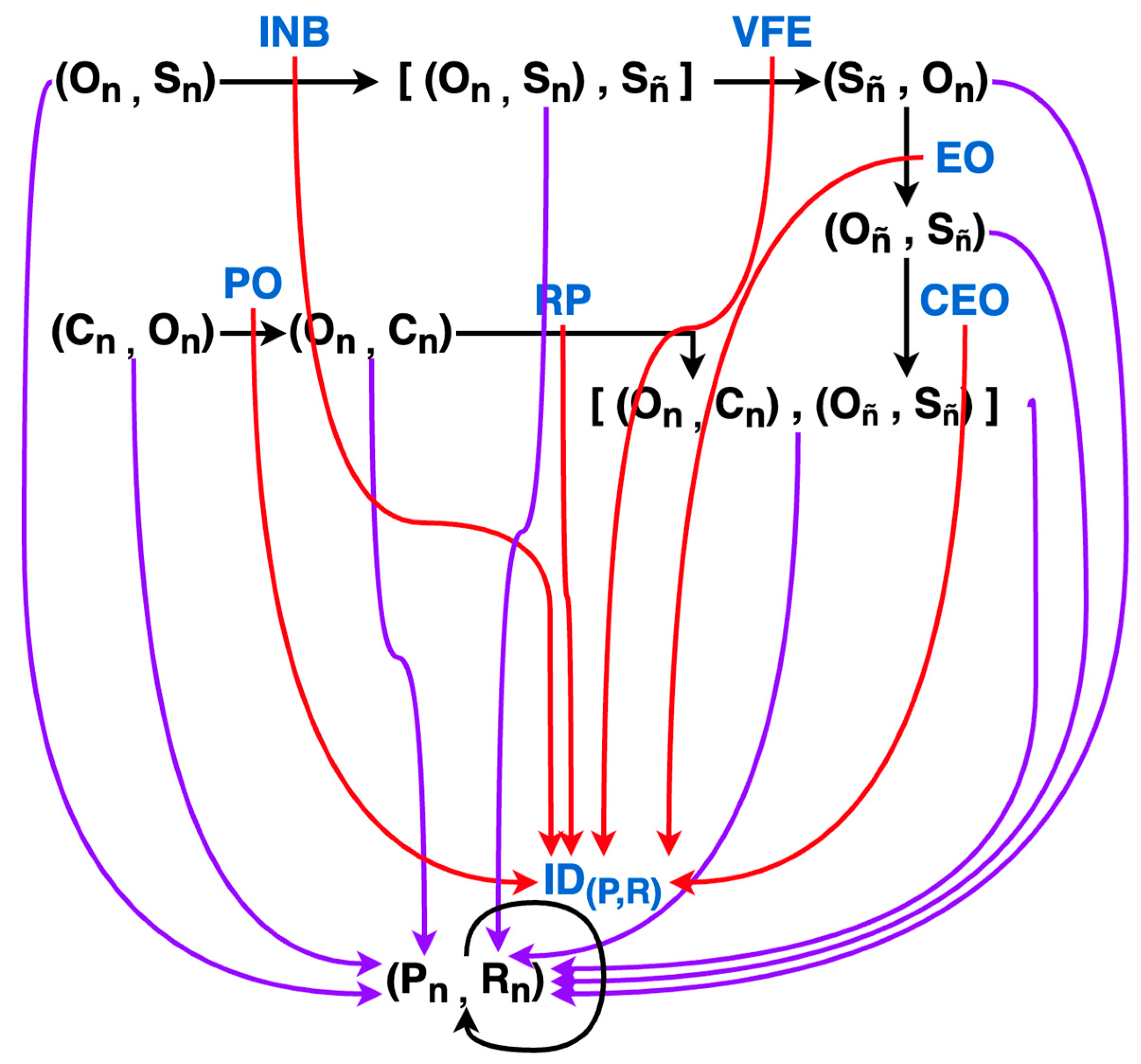 The FEP Agent Category. Morphisms that are internal to the category, that is, actually modeled explicitly by the FEP paradigm, are colored in red. Black morphisms indicate morphisms whose function may not be known and are located in the “environment category”. The blue symbols are the abbreviated names of all morphisms internal to the category, which are not all necessarily named as such in the literature.