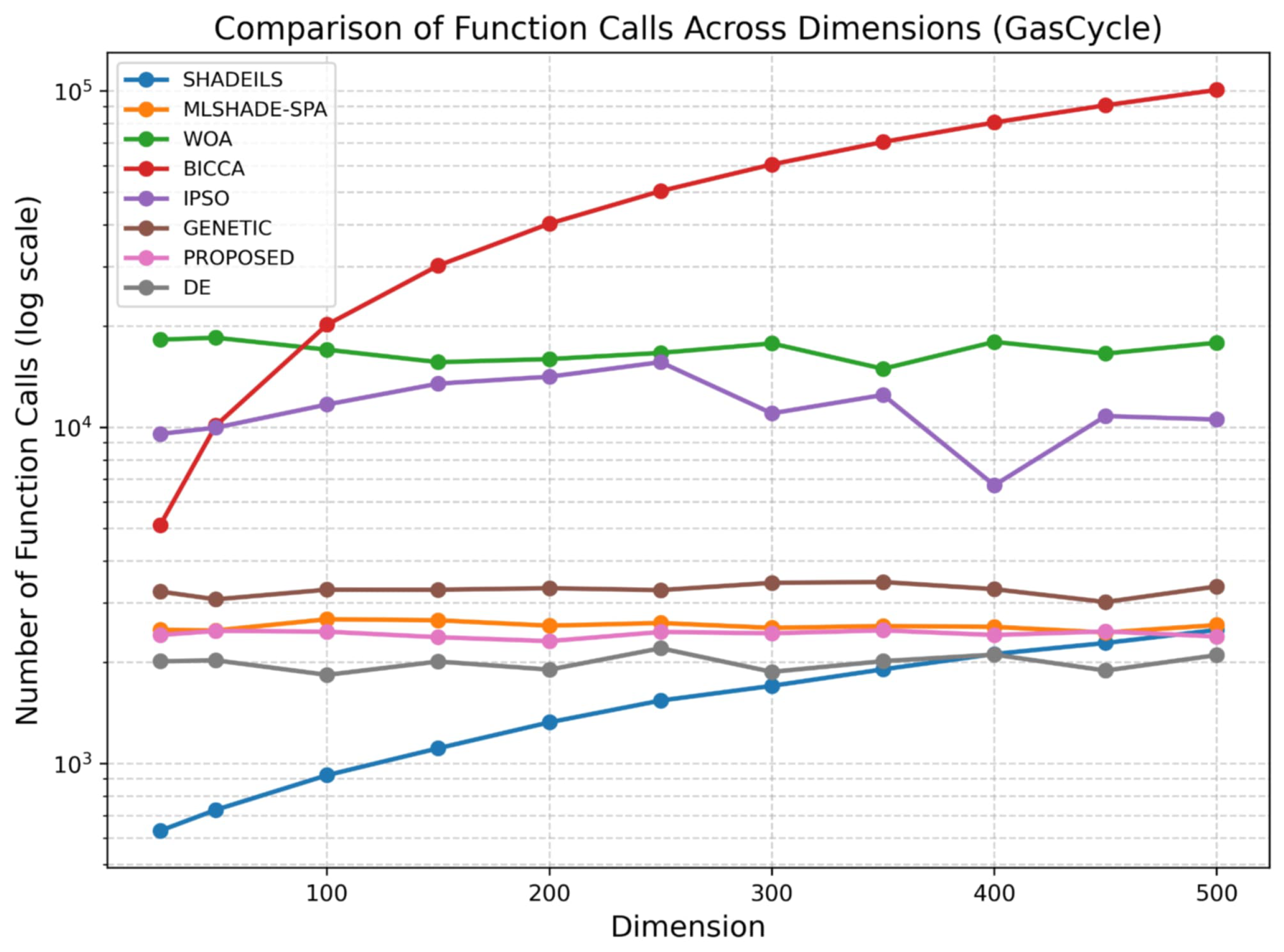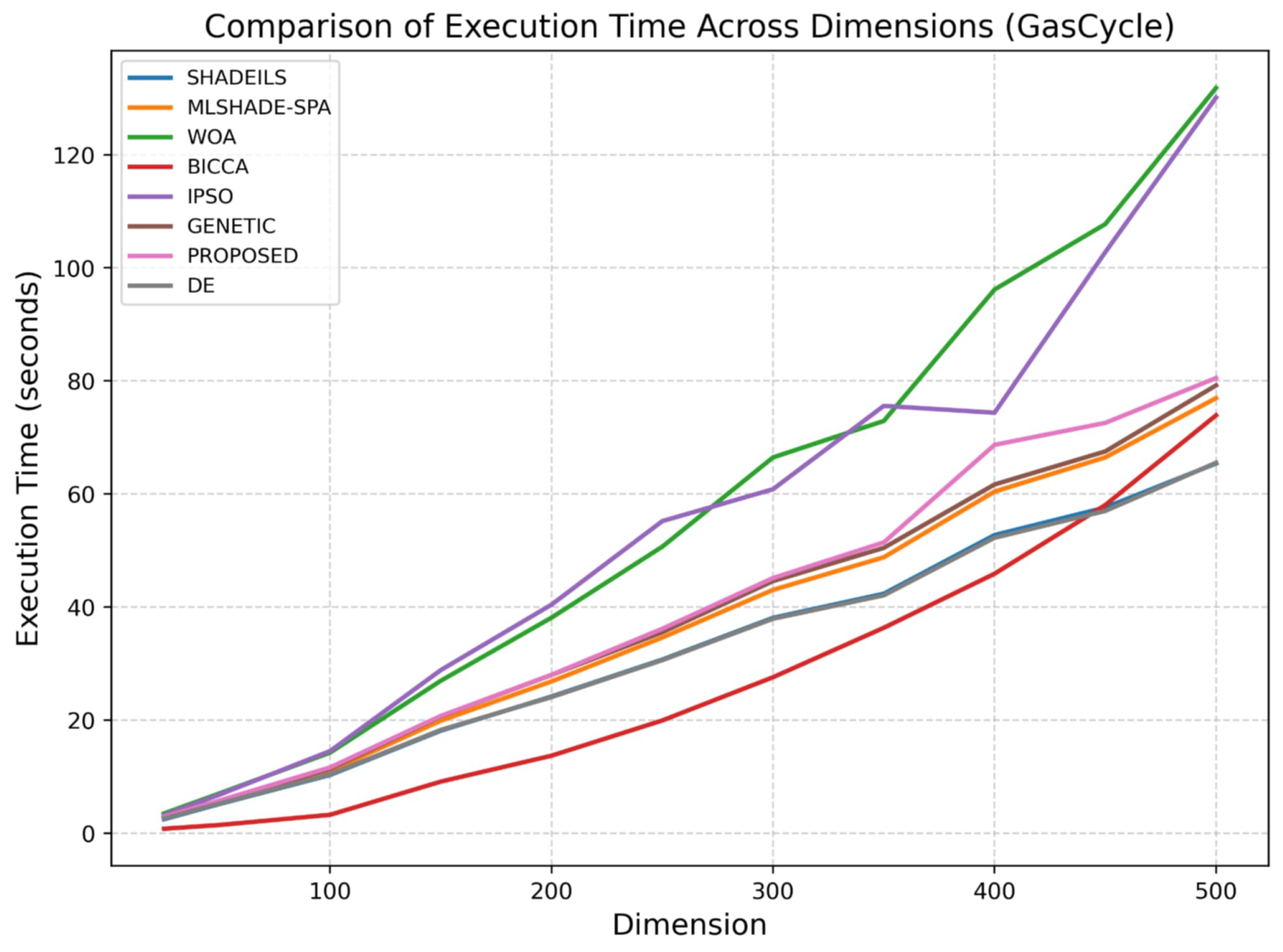 - GasCycle Thermal CycleVars: .Bounds:Penalty: infeasible .The GasCycle scenario presents a more computationally demanding optimization problem, allowing a clearer assessment of algorithmic scalability under increased complexity.For GasCycle, as illustrated in Figure 10, the proposed algorithm maintains a stable and competitive number of function calls across all dimensions. Compared to methods that show pronounced growth in evaluations at higher dimensions, the proposed approach exhibits a more controlled increase, indicating effective adaptation to the structure of the GasCycle problem. This behavior suggests that the method can efficiently utilize function evaluations without excessive computational overhead in large-scale cases.The execution time analysis for GasCycle, shown in Figure 11, aligns closely with the function call results. The proposed algorithm achieves a balanced runtime profile, with execution time increasing smoothly as dimensionality grows. In contrast to approaches that suffer from substantial runtime escalation, the proposed method maintains reasonable computational demands even at high dimensions, highlighting its suitability for complex, large-scale optimization tasks.