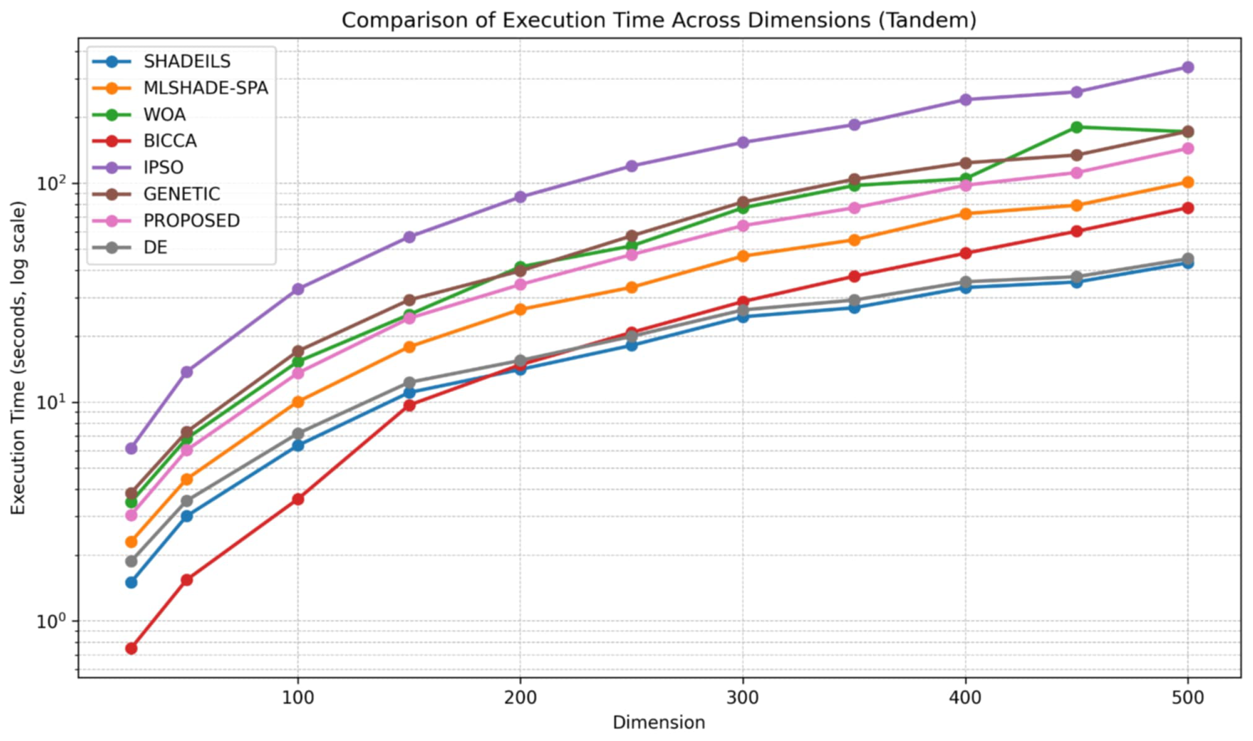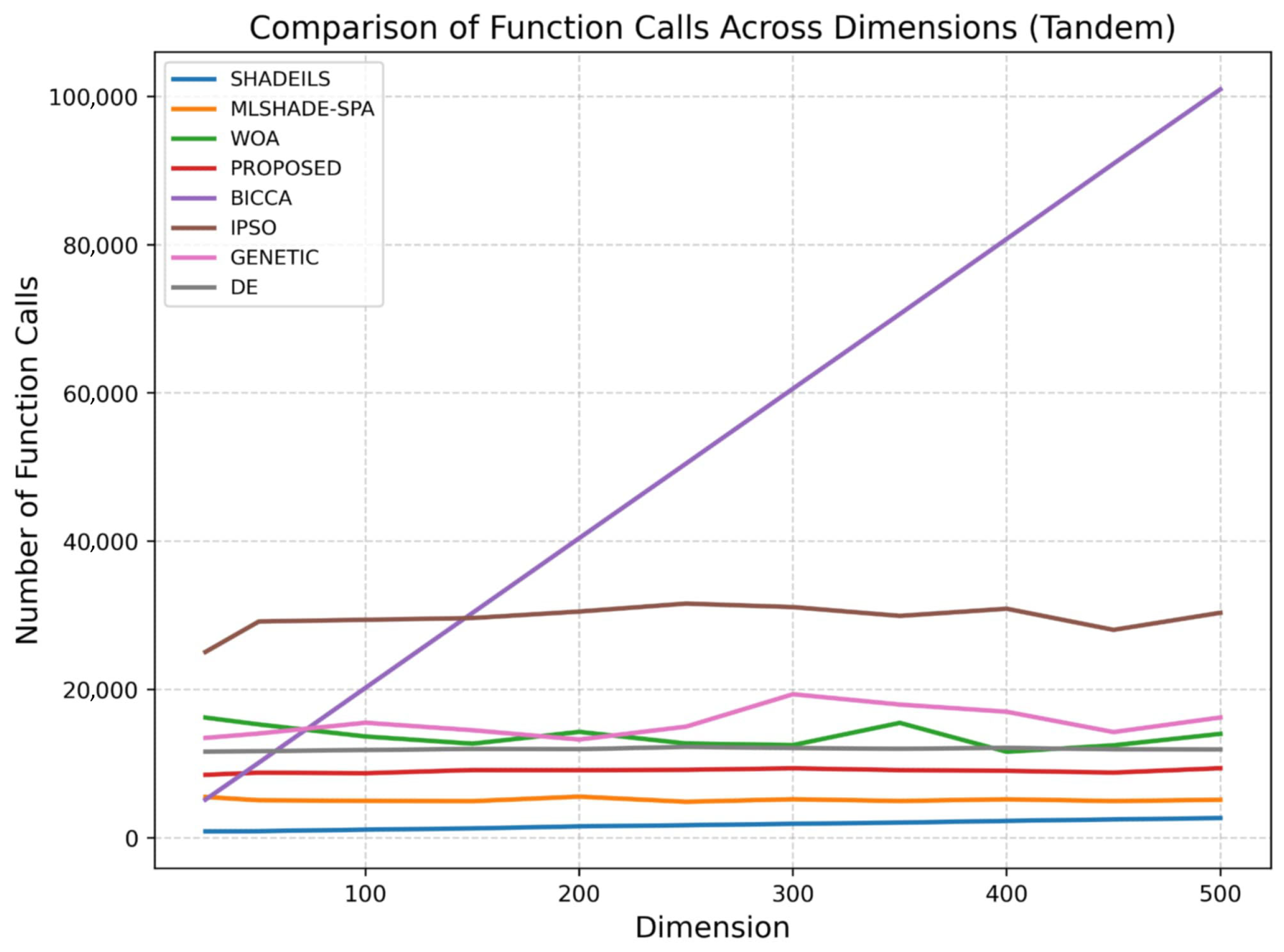 - Tandem Space Trajectory (MGA-1DSM, EVEEJ + 2 × Saturn)Vars (): .Objective:Notes: decreases (log-like) in ( km/s floor); leg/branch costs decrease with TOF.The figures corresponding to the Tandem scenario illustrate the behavior of the evaluated algorithms in terms of function calls and execution time as the problem dimension increases. As expected, higher dimensionality leads to increased computational effort for all methods; however, notable differences in scalability can be observed.In the Tandem case, as shown in Figure 12, the proposed algorithm demonstrates stable and consistent behavior across all tested dimensions, maintaining a relatively low number of function calls. Its performance remains competitive with the most efficient approaches and is clearly more scalable than methods such as the GA, BICCA and IPSO, which exhibit a rapid increase in function calls as dimensionality grows. The controlled growth observed for the proposed method indicates effective search dynamics and an appropriate balance between exploration and exploitation in large-scale settings.The execution time results for the Tandem scenario, presented in Figure 13, further confirm these observations. The proposed algorithm shows smooth and predictable scaling with increasing problem dimensions, avoiding the steep runtime growth observed in more computationally demanding methods. Although execution time naturally increases for larger dimensions, the rate of increase remains moderate, suggesting that the internal computational cost of the proposed approach is well managed and suitable for practical large-scale applications in the Tandem scenario.Across both Tandem and GasCycle scenarios, the proposed algorithm demonstrates consistent scalability in terms of both function evaluations and execution time. Its stable behavior under increasing dimensionality indicates that it represents a reliable and efficient alternative for large-scale optimization problems, without incurring excessive computational cost.