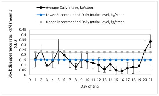 Daily (n = 4 pens; mean ± s.d.) consumption (kg/steer·d −1) of the cooked molasses stress tub (Stress Tub; Purina Animal Nutrition, St. Louis, MO, USA) during the 21-d period it was offered to newly weaned steer calves.