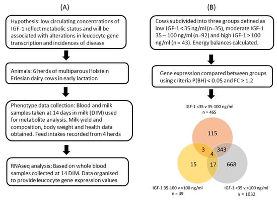 The high disease incidence frequently found in early lactation adversely affects cow welfare, reduces milk production capacity and fertility and increases the likelihood of culling [,]. This has raised the need to improve our understanding of the links between nutrition, metabolism and the immune system during the transition period. Such adverse consequences are more common in multiparous cows []. In comparison with primiparous cows, these also exhibit differences in their metabolic profiles in early lactation, having lower circulating IGF-1 and higher BHB concentrations []. The aim of this study was thus to investigate the relationship between circulating IGF-1 (used as a biomarker of metabolic status), disease incidence and the transcriptomic profiles of leukocytes from high yielding multiparous dairy cows in early lactation.
