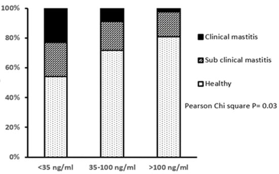 Relationship between circulating IGF-1 concentration at 14 days in milk and the incidence of mastitis in early lactation. Cows were grouped by their circulating IGF-1 concentration as LOW (<35 ng/mL, n = 35), MODERATE (35–100 ng/mL, n = 92) or HIGH (>100 ng/mL, n = 43). The mastitis classifications were: Healthy (SCC < 100,000 cells/mL milk, no clinical symptoms); subclinical mastitis (SCC 100,000 to 400,000 cells/mL milk, no clinical symptoms) or clinical mastitis (SCC > 400,000 cells/mL milk, with clinical symptoms). There was a significant difference in the proportions of cows with different mastitis classification between IGF-1 groups, with fewer healthy and more mastitic cows in the LOW IGF-1 group.