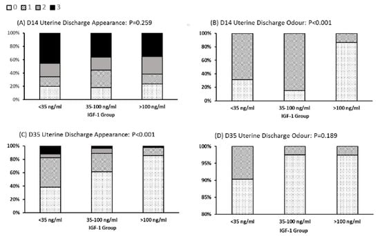 Relationships between IGF-1 category and uterine discharge appearance and odor. Cows were grouped by their circulating IGF-1 concentration as LOW (<35 ng/mL, n = 35), MODERATE (35–100 ng/mL, n = 92) or HIGH (>100 ng/mL, n = 43). Uterine discharge was sampled from the vagina at 14 and 35 days in milk (D14, D35) and scored as: 0, clear or translucent mucus; 1, containing flecks of white or off-white pus; 2, <50 mL exudate containing over 50% white or off-white mucopurulent material; or 3, >50 mL exudate containing purulent material, usually white or yellow, but occasionally sanguineous (A,C). Discharge odor was scored 0 for normal or 1 for fetid (B,D). The graphs are plotted to show the percentage of animals in each IGF-1 category with each score. Note the difference in y-axis scale used for (D). There was a significant difference in classification (Pearson’s chi-squared test) among IGF-1 groups with respect to discharge odor at Day 14 and discharge appearance at D35.