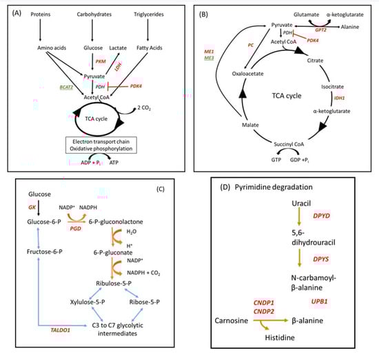 Metabolic pathways which were differentially influenced in leucocytes between cows with LOW (<35 ng/mL) and HIGH (>100 ng/mL) IGF-1 in early lactation #. # Genes encoding enzymes which were up- or down-regulated in LOW IGF-1 cows are shown in red or green font, respectively. (A,B) Energy sources used for adenosine triphosphate (ATP) and guanine triphosphate (GTP) synthesis via the tricarboxylic acid (TCA) cycle. In LOW IGF-1 cows PKM2, PDK4, LDH, GPT2, PC, ME1, IDH1 were all up-regulated whereas BCAT2 and ME3 were down-regulated. (C) The pentose phosphate shunt (PPS) provides an alternative pathway for oxidation of glucose. It has two phases, an oxidative phase (shown in brown), in which NADPH oxidase and ribulose-5-phosphate (a pentose sugar) are generated, and a non-oxidative phase (shown in blue), in which unused ribulose-5-phosphate is converted to other sugar intermediates and returned to the glycolytic pathway. GK, PGD, and TALDO1 were all up-regulated in LOW IGF-1 cows. (D) Part of pathway bta00410:beta-alanine metabolism. DPYD, DPYS, UPB1, CNDP1 and CNDP2 were all up-regulated in LOW IGF-1 cows. See text for further information.