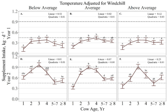 Figure 1. The effect of cow age × year × temperature classification (adjusted for windchill; p = 0.02) on daily supplement intake (kg∙d−1 ±SE; (AF)) for 2 consecutive years by cattle winter grazing northern mixed-grass rangeland. Dashed lines indicate the target intake range. Data points without a common letter differ (p < 0.05). Data adapted from Wyffels et al., 2020 [21].