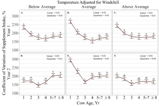 Figure 2. The effect of cow age × year × temperature classification (adjusted for windchill; p = 0.01) on the coefficient of variation of supplement intake (% ±SE; (AF)) for 2 consecutive years by cattle winter grazing northern mixed-grass rangeland. Data points without a common letter differ (p < 0.05). Data adapted from Wyffels et al., 2020 [21].