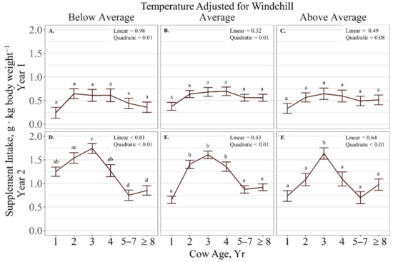 Figure 3. The effect of cow age × year × temperature classification (adjusted for windchill; p < 0.01) on average daily supplement intake (g∙kg body weight−1 ± SE; (AF)) for 2 consecutive years by cattle winter grazing northern mixed-grass rangeland. Data points without a common letter differ (p < 0.05).