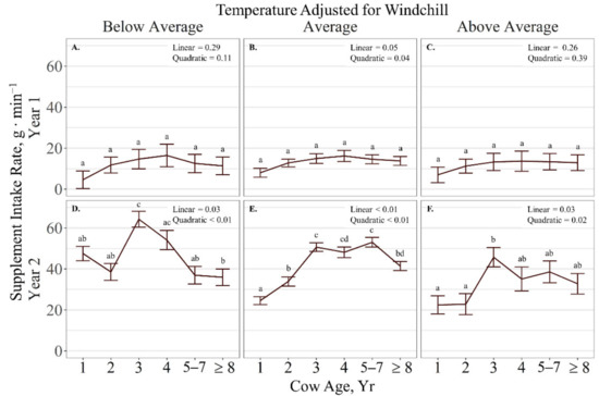 Figure 4. The effect of cow age × year × temperature classification (adjusted for windchill; p < 0.01) on supplement intake rate (g∙min−1 ± SE; (AF)) for 2 consecutive years by cattle winter grazing northern mixed-grass rangeland. Data points without a common letter differ (p < 0.05).