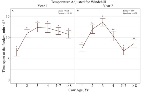 Figure 5. The effect of cow age × year (p < 0.01) on average time spent at the supplement feeder (min∙d−1 ± SE; (A,B)) by cattle winter grazing northern mixed-grass rangeland for the 2 years at the Northern Agricultural Research Center Thackeray Ranch, Havre, MT, USA. Data points without a common letter differ (p < 0.05). Data adapted from Wyffels et al., 2020 [21].