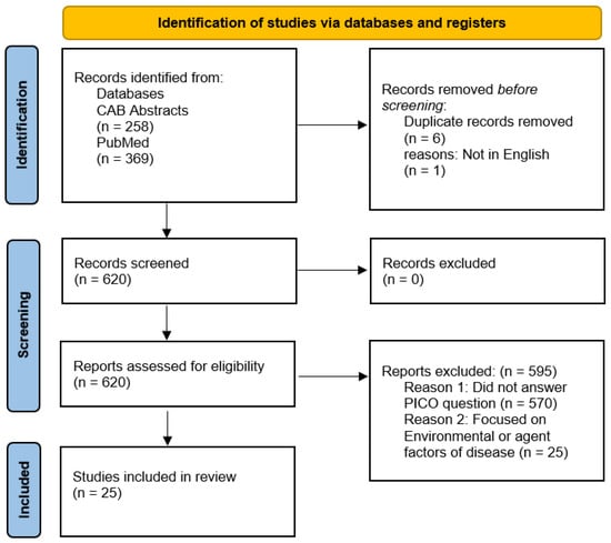 PRISMA flow diagram for articles sourced from CAB Abstracts and PubMed databases using the terms: TOPIC: (host) AND TOPIC: (transmission OR spread) AND TOPIC: (cattle OR bovine) AND TOPIC: (digital dermatitis).