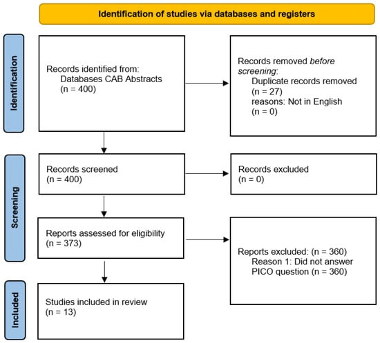 PRISMA flow diagram for articles sourced from CAB Abstracts databases using the following terms: TOPIC: (production OR lactation OR fertility) AND TOPIC: (cattle OR bovine) AND TOPIC: (digital dermatitis).