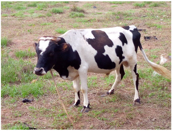 The Lagune cattle (Figure 1) is a West African dwarf shorthorn cattle type described as a small-bodied animal, blocky in conformation with short and fine-boned limbs [15,21,28,29,30]. It has a compact body, no hump, a straight back, and a broad head. The face is slightly dished, and the horns are very short. The dominant coat colour is generally black, white, pie black, black pie [21,28,29,30]. Some linear traits have been measured in the Lagune cattle by several authors. Reported average height at withers varies from 80 to 100 cm for adult females and is about 105 cm for adult males [15,21]. It varies from 80.6 to 96.2 cm according to Domingo [20] and was estimated at 82.2 ± 2.4 cm by Traoré et al. [31]. The heart girth averages 110.5 ± 4 cm [31] and ranges from 102.8 to 136.3 cm according to Domingo [20]. The scapula-ischial length varies from 92.3 to 119.7 cm for 1.2 to 5 years old animals, respectively [20]. The body length (from lateral tuberosity of the humerus to tuber ishii) averages 98.9 ± 3.4 cm [31].