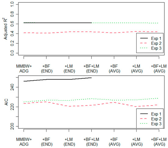 The AIC and adjusted R2 values are presented in Figure 1 for the three experiments. The estimates, standard errors, and p-values for the model with BF and LM at the end of the experiment are given in Table 5. For experiments 1 and 3, the best-fitting model based on adjusted R2 and AIC values is the simplest model without the BF and LM. The adjusted R2 values for these two datasets varied between 0.61 and 0.63. For experiment 2, the models with the LM (either at the end or the average of the beginning and end values) fitted slightly better, with adjusted R2 values of 0.44, compared to 0.42 of the model with only the MMBW and ADG as covariates. However, the p-value of the LM term was 0.02–0.04 in the two alternative models without the BF term, which is not strong evidence given that the models were fitted to three distinct datasets. A simple Bonferroni correction, without even considering the multiple parameters in the model, [24] to the p-values would result in an adjusted p-value of 0.06–0.12, i.e., the result is not statistically significant after adjusting for the three separate fits.
