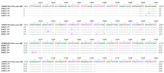 Using the PCR-SSCP method, four different patterns were found on PCR products on polyacrylamide gels. In the NCBI GeneBank OP535358-OP535361, four unique PCR-SSCP patterns were deposited as sequences P1, P2, P3, and P4. The sequences obtained from sanger sequencing were accelerated by the Clustal W algorithm in the Bioedit program and crosschecked with the accession number AF002110.1 (Figure 1).