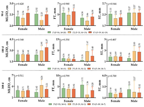 In real-time ultrasound measurements, none of the three parameters (MLDD, FT, and ST) differed significantly between female and male lambs on the basis of GHE5 variants (p > 0.05; Figure 3). Taking into account the number of P2 variants at the sixth month and yearling, it is obvious that the MLDD of P3 variant male lambs is higher than that of other variants.