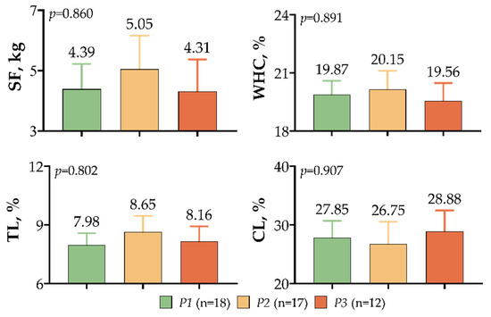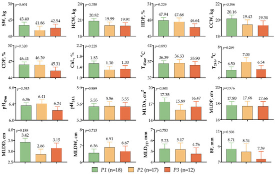 A close relationship has been shown between GH and IGF1 since GH stimulates the liver to express IGF1, which negatively affects pituitary GH production [48,49]. Thus, it is possible to select carcass traits correlated with body growth by considering polymorphisms in GH and IGF1 in this case [49]. The carcass parameters did not differ significantly between GHE5 variants (p > 0.05). However, the SW, HCW, and CCW of P1 variants were higher than those of the other variants by 0.86–1.54 kg, by 0.83–0.91 kg, and by 0.73–0.82 kg, accordingly (Figure 4). In addition, P1 variants had higher MLDA (17.35 cm2), MLDP (17.80 cm), and MLDD (3.42 cm) values, whereas P3 variants had lower BF (7.39 mm) and MLDFT (4.76 mm).