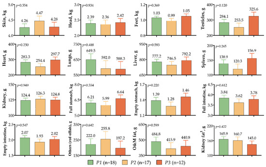 In Figure 5, the effects of GHE5 polymorphism on noncarcass components are presented. There was no significant difference between the non-carcass components (p > 0.05). It is noteworthy that the head (0.03–0.06 kg), feet (20–60 g), testicles (41.5–72.1 g), heart (14.4–43.3 g), liver (15.0–45.7 g), spleen (18.0–36.6 g), full stomach (0.43–0.65 kg), and empty stomach (0.07–0.18 kg) weights were higher in the P3 variant; lung (57.5–61.2 g), full intestine (0.06–0.22 kg), empty intestine (0.05–0.014 kg), omental and mesenteric fat (44.0–68.9 g), and kidney fat (5.2–11.0 g) weights were higher in the P1 variant; skin (0.19–0.21 kg), kidney (1.5–1.9 g), and other (red offals) weights (33.8–58.6 g) in the P2 variant.