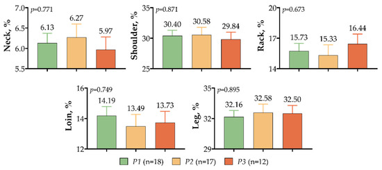 The GHE5 polymorphism had no significant effect on meat-type lamb neck, shoulder, rack, loin, or leg proportions, as shown in Figure 6. There was a higher neck (0.14–0.30%), shoulder (0.18–0.74%), and leg (0.08–0.42%) percentage in the P2 variant, whereas the P3 variant had a higher rack (0.71–1.11%) percentage, and the P1 variant had a higher loin (0.46–0.70%) percentage.