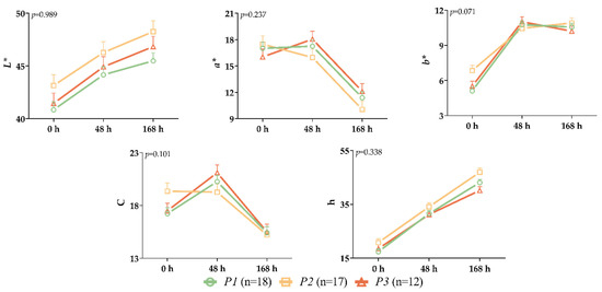As shown in Figure 8, no significant interactions between genotype and time were observed for all color parameters at various storage periods (p > 0.05). A clear trend can be observed in terms of L* and h values in all variants. After 48 h of storage, a decrease in a* and C was detected up to the 168th h. At the end of the storage period, the P2 variant had higher L*, b*, and h values than the other variants but had lower a* and C values.
