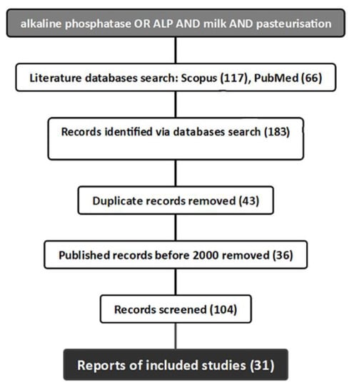 Three reviewers (EM, AM, SF) searched electronic databases (SCOPUS and PUBMED) using the following keywords: alkaline phosphatase OR ALP AND milk AND pasteurization. Studies identified from the search of the electronic databases were combined, duplicates were removed, along with articles published before the year 2000, and the remaining papers were screened for relevance to the review based on the information contained in their titles and abstracts. Abstracts were screened by another reviewer (TT) and potentially eligible papers were identified.