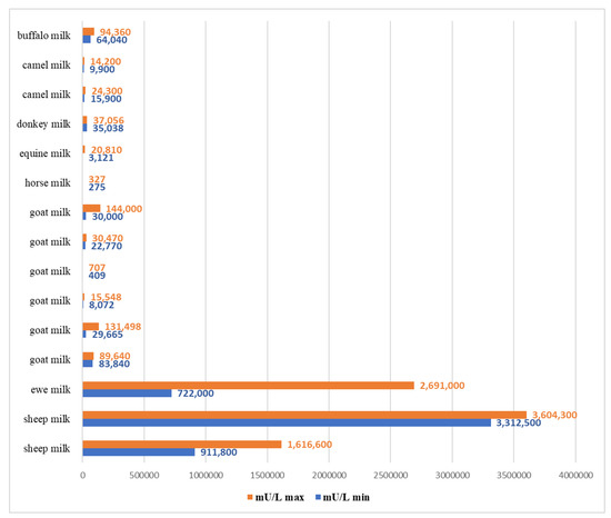 Figure 3. ALP activities in non-cow raw milks [13,14,22,25,27,30,32,38,39,41].