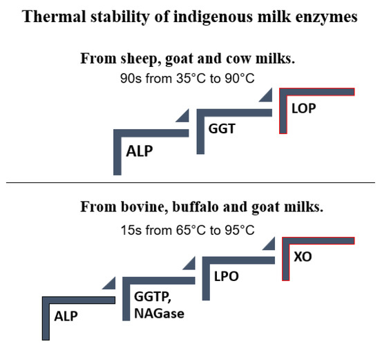 Figure 5. Thermal stability of indigenous milk enzymes in different types of milk [13,30]. ALP: alkaline phospahtase, GGT: γ-glutamyl transpeptidase, LPO: lactoperoxidase, NAGase: N-acetyl-β-glucosaminidase, XO: xanthine oxidase.
